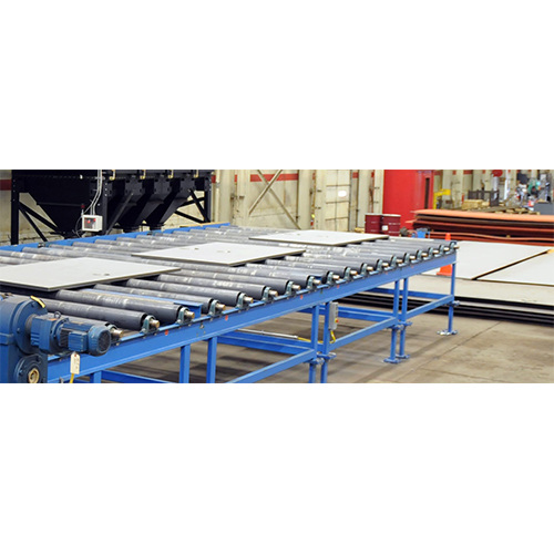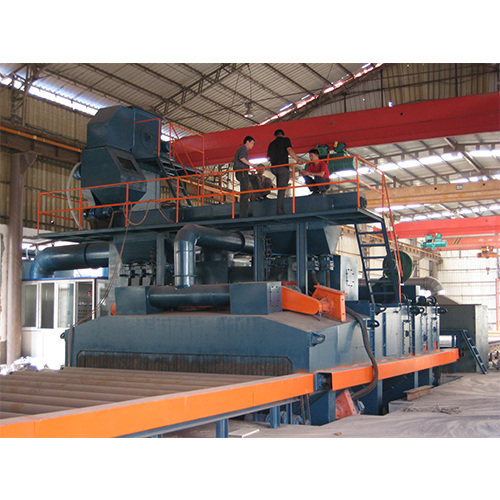 Cet équipement est une ligne de production de prétraitement de tôles dacier à haut rendement et à fonctionnement continu. La tôle dacier entre dans la chambre de grenaillage après avoir été préchauffée par le convoyeur à rouleaux. Un certain nombre de grenailleuses à haut rendement dans différentes directions de coordonnées utilisent la grenaille dacier pour produire un fort impact et une forte friction, ce qui entraîne la chute rapide de la couche doxydation, des taches de rouille et de la saleté sur sa surface, pour obtenir une surface dacier propre et renforcée. Pendant le processus de grenaillage, le mélange de grenaille et de poussière dispersé est collecté sous le palan par lentonnoir de la chambre principale et le convoyeur à vis longitudinal ; il est ensuite soulevé vers le séparateur situé au-dessus de la machine pour la séparation de la grenaille et de la poussière. Les granulés séparés tombent dans la goulotte du séparateur. Il est transporté vers chaque grenailleuse pour être recyclé par les tuyaux de transport sur place. La poussière générée pendant le processus de travail est acheminée vers le système de dépoussiérage par le tuyau déchappement. Lair purifié est rejeté dans latmosphère après purification. Léquipement de dépoussiérage capte et collecte les particules de poussière.