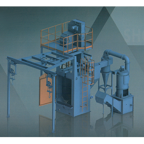 待抛丸的工件直接挂在吊钩或吊架上,人工带到抛丸室前部的牵引系统,吊钩自动进入抛丸室。